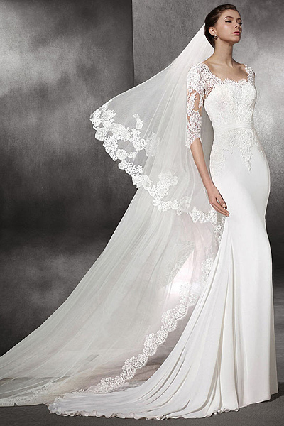 Most Popular Court Train Buttons Tulle A-line Long Sleeves Wedding Dresses (PGRK3763)