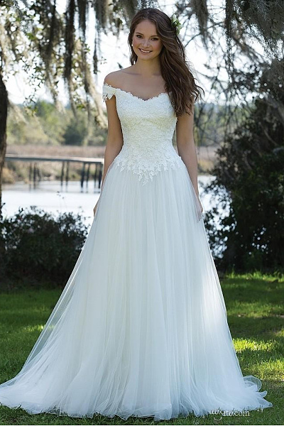 Charming Sweetheart Off-the-shoulder Lace Applique Tulle Ball Gown Wedding Dress (XZDL5687)